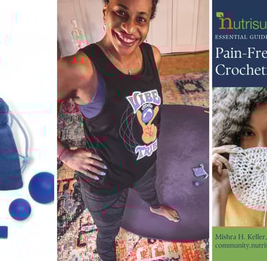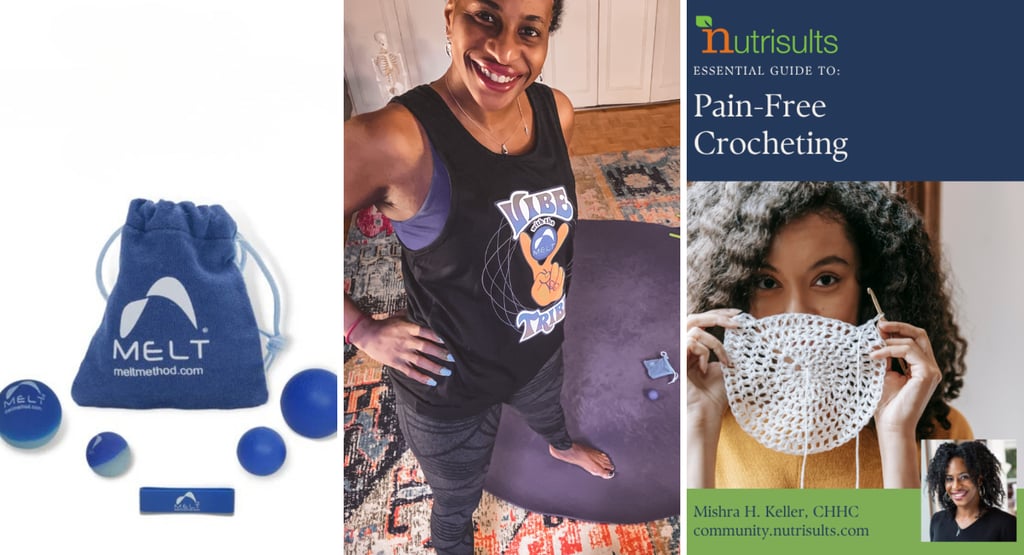 This bundle combines targeted, expert-curated tools and resources including the MELT Method Hand and Foot Therapy Ball Custom Kit, access to my 7-Day Low Back Pain MELT Challenge, and the Nutrisults Essential Guide to Pain-Free Crocheting ebook. Together, these components work to relieve pain from your hands, feet, and lower back—areas that often suffer during long crafting sessions.